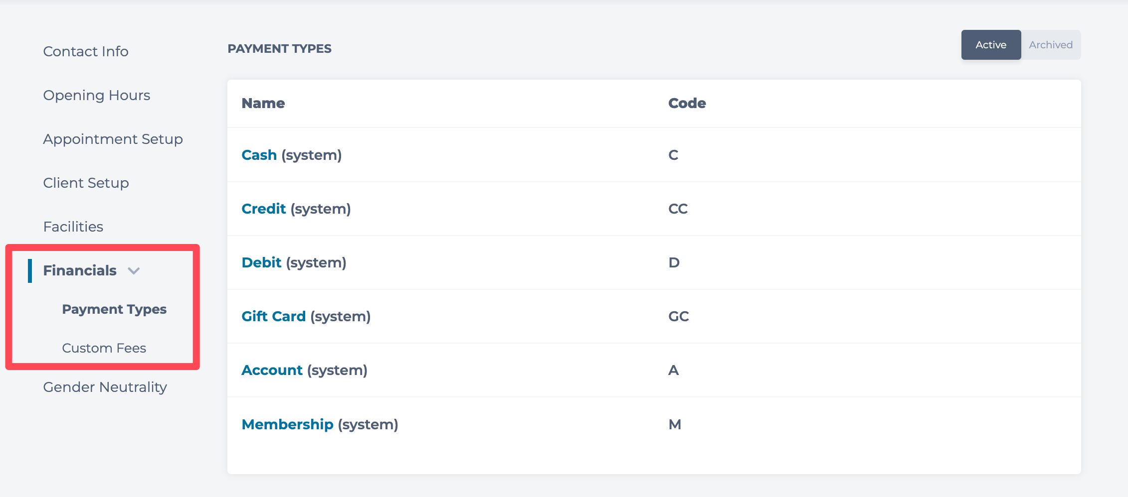 The Financials section lets you create and manage your Payment Types and create Custom Fees.