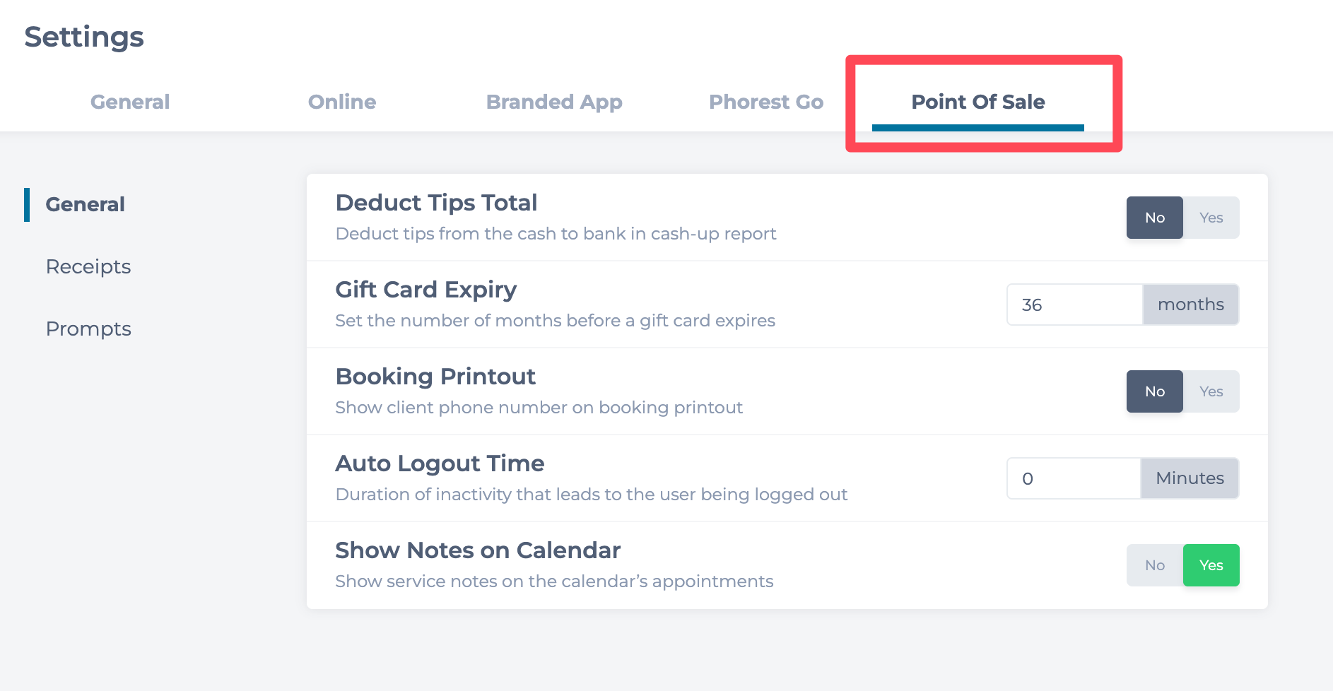 Point Of Sale settings are broken into three sections: General, Receipts, and Prompts.