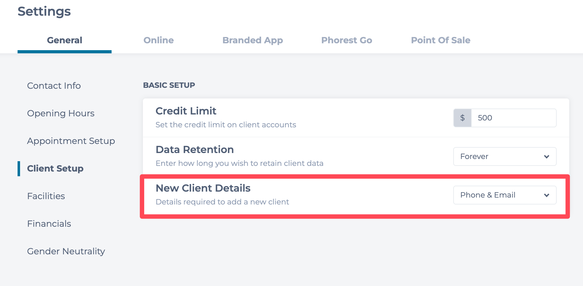 You can update your Phorest settings to require a client's email, phone number, or both when creating a new client. For more information, click here.
