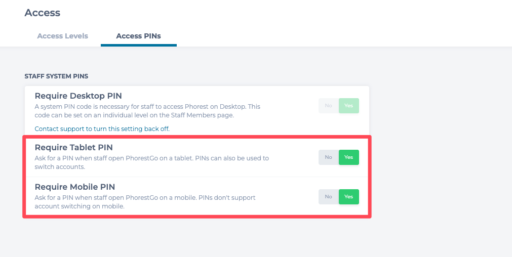 Go to Manager > Access > Access PINs, then select whether you would like to enable PINs on tablets, mobile (smartphones), or both, and click Save to finish.