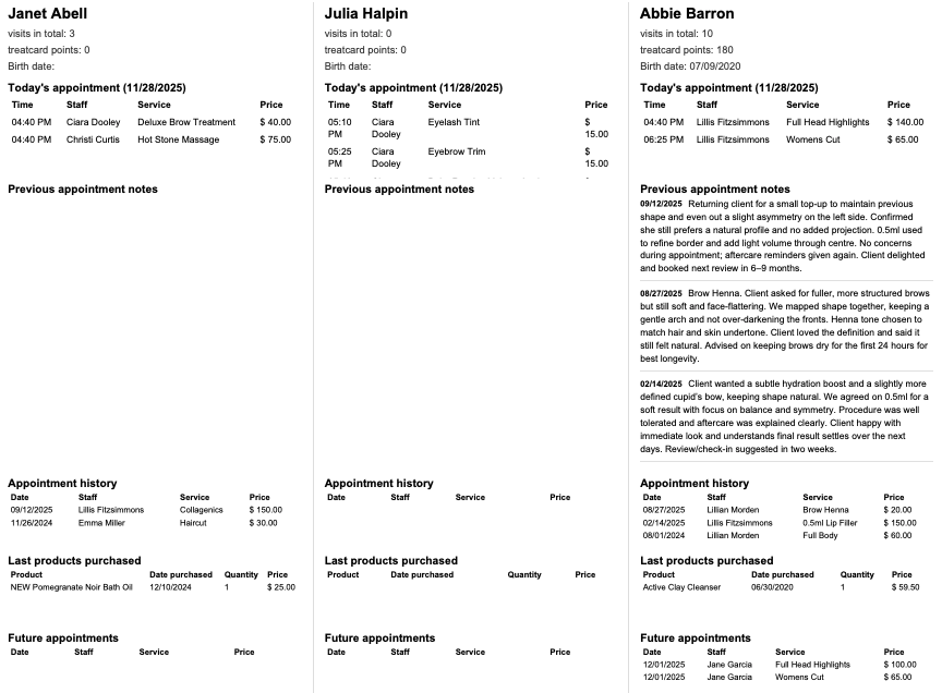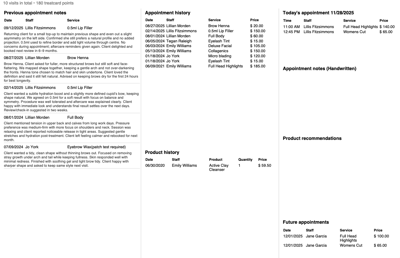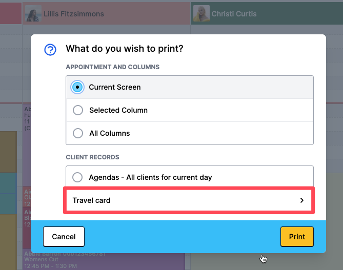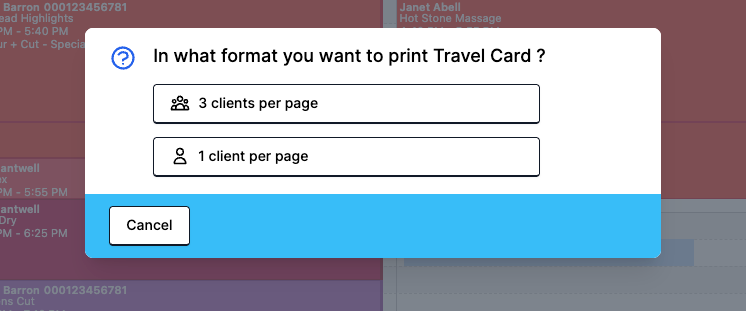 This article explains how to print client Travel Cards, which include details on a client's current appointment, appointment history, product history, past appointment notes, and more.