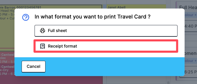 Next, to print, choose Travel card > Receipt format, and your travel card will be printed using your receipt printer.
