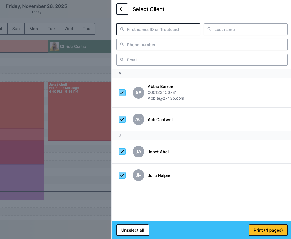 After selecting your print preference, select the clients you would like to print a travel card for. The Print button will show you how many A4 pages you will print with your client selection.