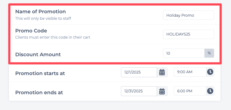 Note: If sharing with VIP clients, we recommend setting a limit in the Max Promo Code Uses field to ensure the code is unique to your loyal clients and prevent them from sharing it with a larger audience.