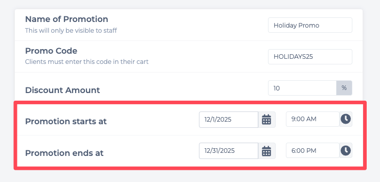 Finally, specify the date and time you would like the Promotion to start and end. The Promotion code will only work during this period and will automatically stop working once the Promotion ends at time has been reached.