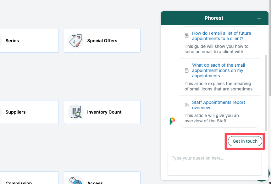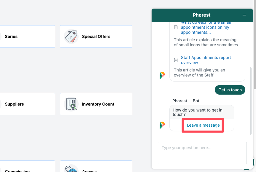Next, you can ask the Phorest Support Bot a question to get an instant answer, or click Get in touch > Leave a message to log a ticket.