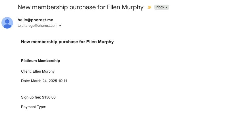 Kun asiakas ostaa jäsenyyden verkossa, saat sähköposti-ilmoituksen ostotiedoista.