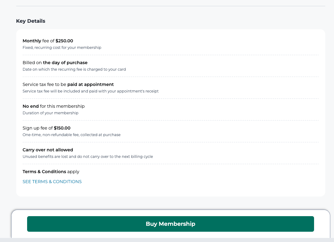 Painamalla Lisätiedot näytetään yksityiskohtainen erittely jäsenyydestä asetustesi perusteella sekä vaihtoehto ostaa se.