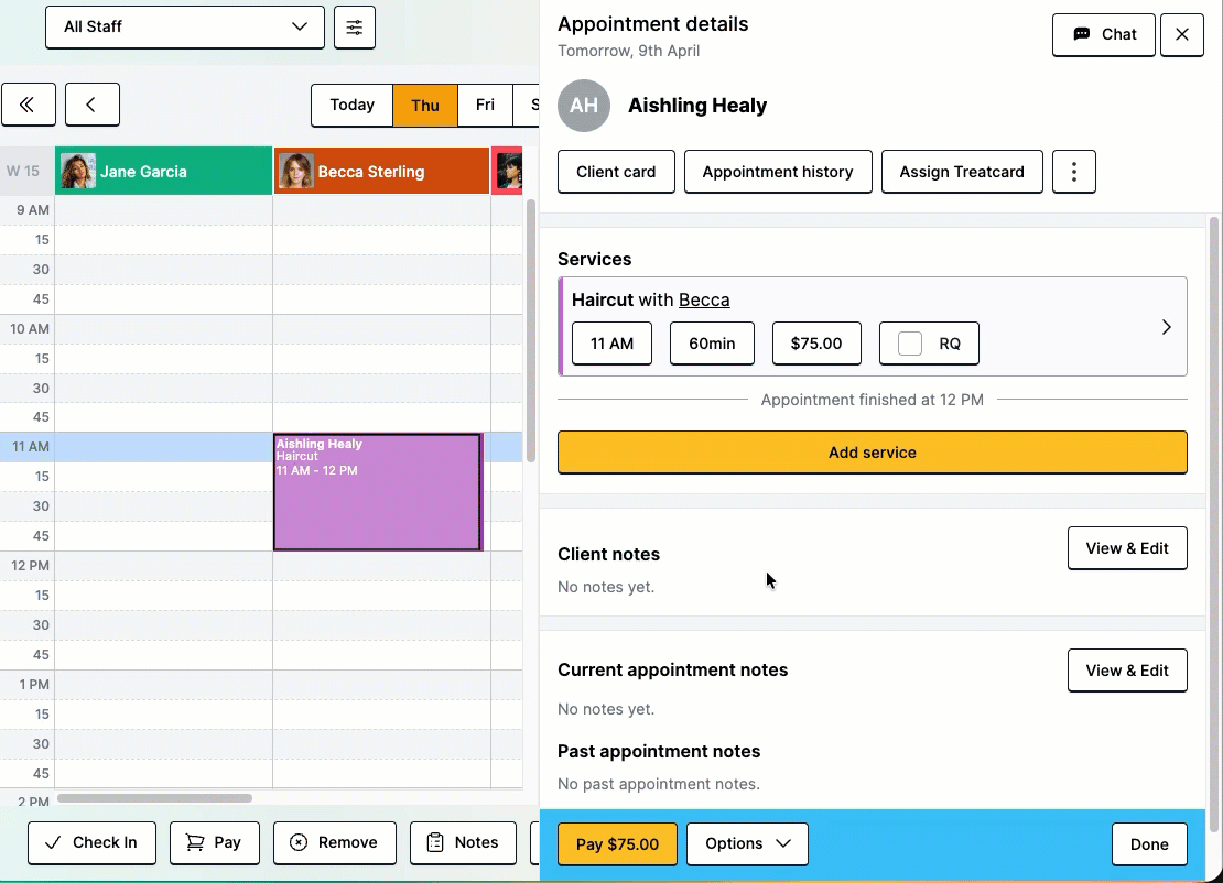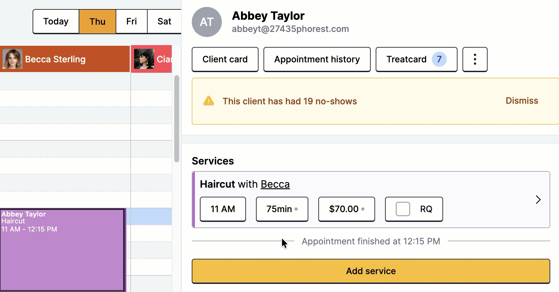 Kun mukautettu asiakashinta tai kesto on asetettu, sitä käytetään kaikissa sen jälkeen luoduissa uusissa ajanvarauksissa. Se päivitetään myös automaattisesti, jos olemassa oleva ajanvaraus siirretään toiselle työntekijälle tai päivälle, edellyttäen että mukautetut asetukset ovat edelleen voimassa siirron aikaan.